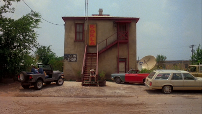 Specifically, infamous finale shot pullback -- Stretch's Chainsaw Dance -- revealing the line of cars driving along a highway in the background, near the bottom of the screen.